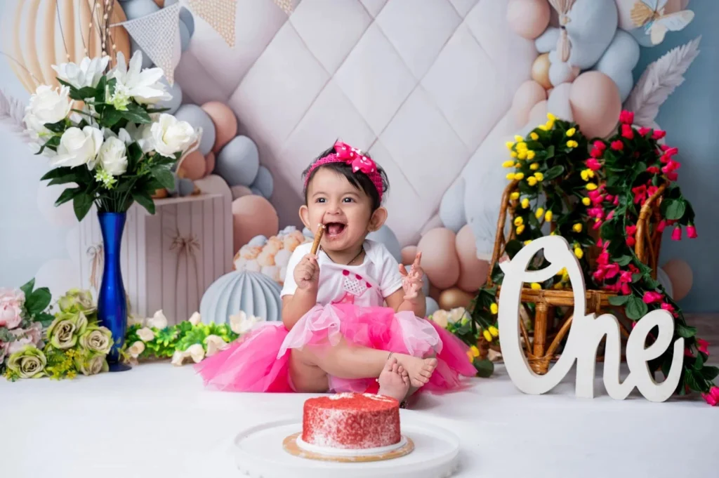 Special birthday packages available with themed setups, decorations, balloons, and cake smash opportunities for memorable first birthday celebrations.